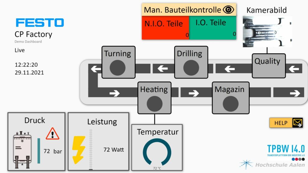 Die Entwicklung des Prototyps dauerte einen Nachmittag und geschah in Eigenregie durch das Team um Maximilian Hentsch, wissenschaftlicher Mitarbeiter der Transferplattform. „Die visualisierte Anlage ist eine Festo Didactic CP Factory mit einer Anlagensteuerung von Siemens (S7). Die Daten werden über einen OPC-UA-Server auf dem MES-Leitrechner zugänglich gemacht. Ein HDMI-Monitor in der Nähe der Anlage ist mit einer Peakboard Box verbunden“, erklärt Hentsch. Die Peakboard Box ist via WLAN in das Netzwerk der Anlage integriert und aktualisiert die Daten im Sekundentakt. Das Dashboard zeigt folgende exemplarische Informationen an: Zustand und Aktivität der Fertigungsstationen, Temperatur des Heiztunnels, Druck der Druckluftversorgung inklusive Alarmierung bei zu niedrigem Druck sowie letztes erfasstes Kamerabild der Qualitätsstation (vom Webserver der Kamera).