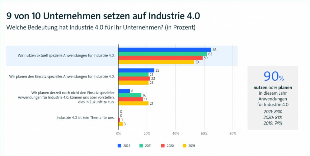 Nach Angaben des Branchenverbandes Bitkom könnten im Jahr 2030 bei einem beschleunigten Einsatz digitaler Technologien in Deutschland bis zu 64Mio. Tonnen CO2 eingespart werden – 17 Prozent der insgesamt geplanten CO2-Einsparungen im Rahmen des Klimaziels 2030. 65 Prozent der Industrieunternehmen ab 100 Beschäftigten nutzen laut einer aktuellen Bitkom-Befragung spezielle Anwendungen aus dem Bereich Industrie 4.0, weitere 25 Prozent planen den Einsatz. „Insgesamt setzen 90 Prozent der Unternehmen auf Industrie 4.0 – und investieren dafür rund 6 Prozent ihres gesamten Jahresumsatzes“, so Christina Raab, Mitglied im Bitkom-Präsidium. Vergangenes Jahr waren es nach Bitkom-Angaben noch 83 Prozent, im Jahr 2019 74 Prozent. 8 Prozent planen laut Befragung derzeit keinen Einsatz spezieller Anwendungen, können sich aber vorstellen, dies in Zukunft zu tun. Jedes zweite Unternehmen (50 Prozent) nutzt laut Befragung etwa digitale Marktplätze. Virtual und Augmented Reality ist bereits in 31 Prozent der Unternehmen im Einsatz, 5G nutzen 29 Prozent. 38 Prozent setzen künstliche Intelligenz ein, etwa zur Automatisierung von Produktionsprozessen. Digitale Zwillinge werden in jedem dritten Unternehmen (33 Prozent) eingesetzt. Immerhin 39 Prozent der befragten Industrieunternehmen sehen sich als Vorreiter der Industrie 4.0. Andererseits gruppieren sich 51 Prozent sich als Nachzügler. 7 Prozent der Unternehmen fühlen sich abgehängt. Den größten Nachholbedarf hat der Mittelstand. Dort bezeichnen sich 58 Prozent als Nachzügler.