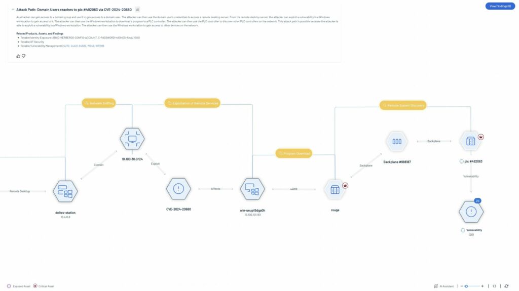 Nicht selten haben Übergriffe auf OT- und IoT-Umgebungen ihren Ursprung in kompromittierten IT-Assets, die Hackern erweiterte Berechtigungen verschaffen und Ransomware-Angriffen Tür und Tor öffnen. Tenable One für OT/IoT ermöglicht ein domänenübergreifendes Verständnis der Beziehungen zwischen den Assets und visualisiert Angriffspfade, bei denen ein hohes Risiko einer Ausnutzung besteht. Um den kritischsten Angriffspfad zu identifizieren, berücksichtigt die Plattform mehrere Parameter und verwendet einen risikobasierten Ansatz. Die Zuordnung von Faktoren wie dem Risikograd von Assets, der Länge des Angriffspfads, den Kommunikationsprotokollen und der externen bzw. internen Konnektivität ermöglicht eine effektivere Priorisierung und Behebung von Problemen. Auf diese Weise können Unternehmen und Sicherheitsexperten beispielsweise den Zugang zu externen Netzwerken minimieren oder reduzieren oder Ports schließen und nicht zwingend erforderliche Services, die die Risikoexposition erhöhen, entfernen.