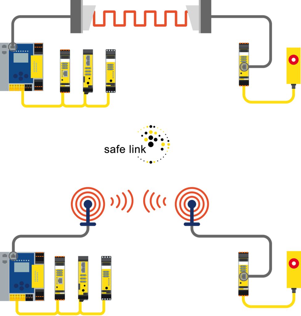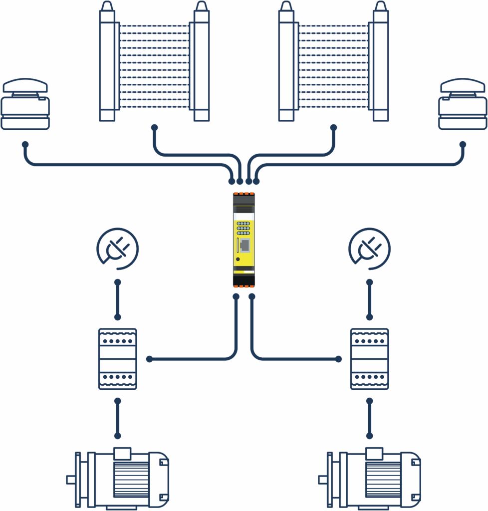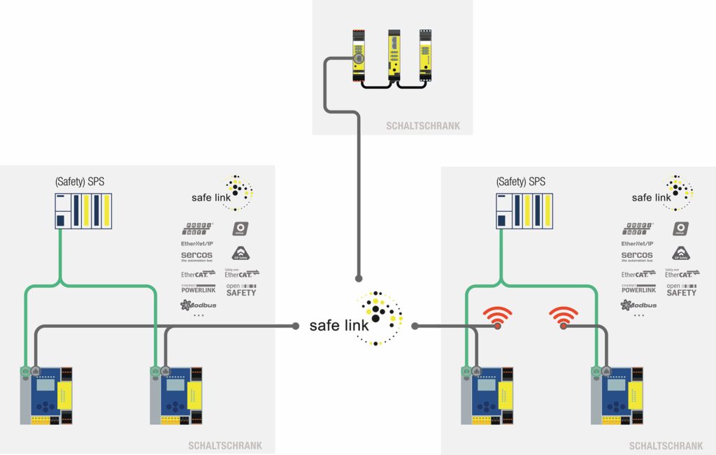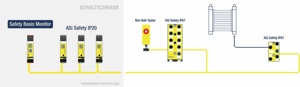 Eine weitere Möglichkeit, den Umfang der Applikation zu erweitern, besteht darin, die Kleinsteuerung, die selbst nur eine ModbusTCP-Anbindung für Diagnosezwecke besitzt, mit anderen sicheren Steuerungen zu verbinden. Dabei kann es sich ebenfalls um Safety Basis Monitore handeln oder um ASi-5/ASi-3-Feldbus-Gateways von Bihl+Wiedemann mit ASi-5- bzw. ASi-3-Safety-Technik. Mit diesen Gateways lassen sich zum einen neben sicheren Signalen auch Standarddaten einsammeln und über einen Feldbus an eine SPS übertragen. Zum anderen gibt es auch Varianten für sichere Feldbusse sowie mit FSoE-Master- bzw. CIPSafety-Originator-Funktionalität, mit denen sichere Antriebe direkt parametriert und angesteuert werden können.