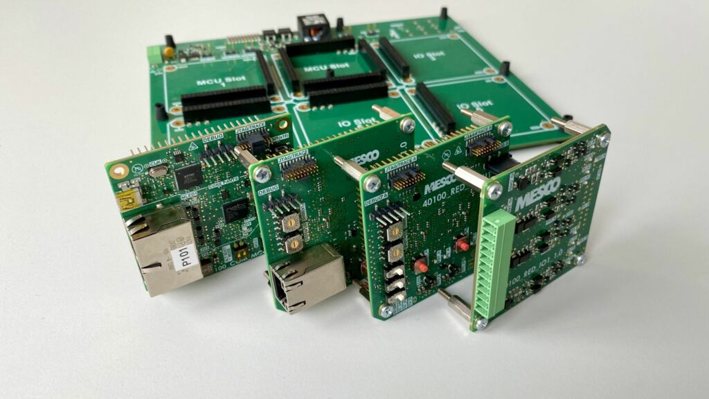Während Functional-Safety-Produktentwicklungen auch mit Lockstep oder anderen spezialisierten Prozessoren realisierbar sind, realisiert Mesco für die Prozess- und Fabrikautomatisierungsindustrie kostengünstigere Sicherheits-Hardware und -Software mit Standard-STM32-Mikrocontrollern. Bei den meisten Kundenprojekten handelt es sich um Sensoren, Aktoren, sicherheitsgerichtete Ein- und Ausgänge oder Sicherheits-Optionskarten für Antriebe mit Geberanschlüssen, auf Basis von IEC61508/SIL2 oder SIL3 mit kurzen Reaktionszeiten. In diesen Fällen wählt Mesco häufig eine zweikanalige Architektur (1oo2) und realisiert die notwendige Kommunikation zwischen den Mikrocontrollern, z.B. über einen UART mit Geschwindigkeiten von bis zu 27Mbit/s für STM32F7.