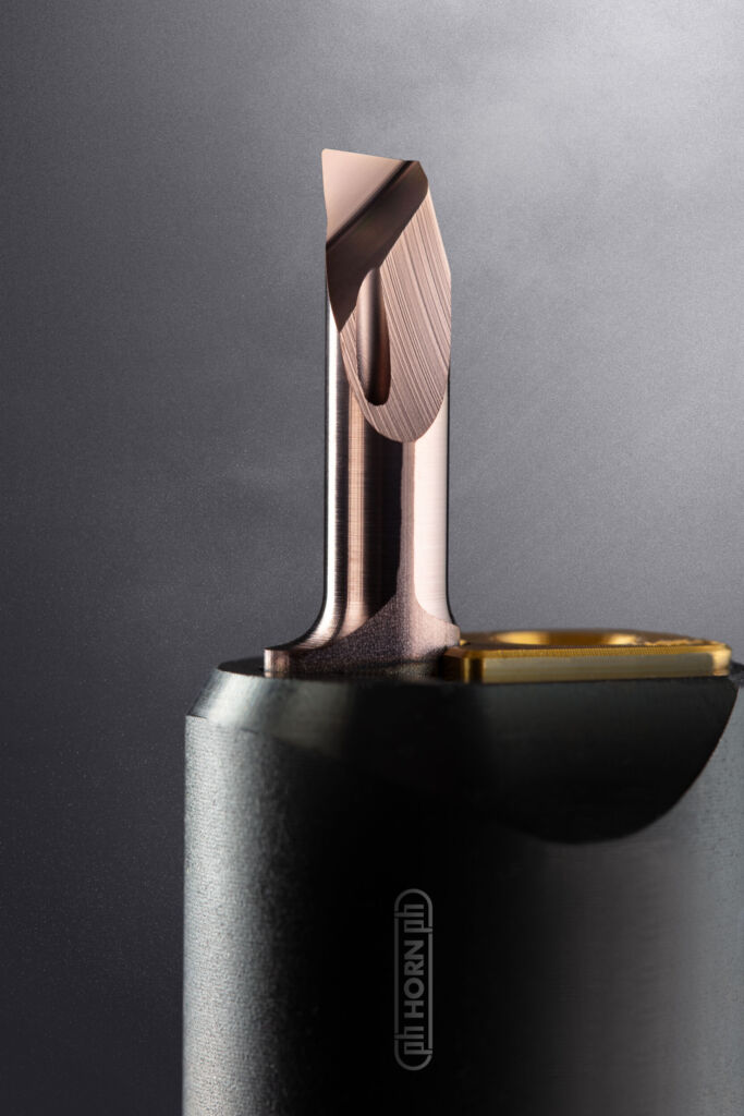 Speziell zum Ausdrehen rostfreier Stähle erweitert Horn das System Supermini um eine neue Variante. Die optimierte Schneidengeometrie sorgt in Verbindung mit der Schicht IG35 für eine hohe Produktivität und Prozesssicherheit. Mit einer Schichtdicke von nur 0,003mm und einer maximalen Einsatztemperatur von rund 1.100°C erreicht das Werkzeug im Schnitt die doppelte Standzeit gegenüber herkömmlichen Schichten. Die Beschichtung der Werkzeuge geschieht bei Horn ‚inhouse‘ in den eigenen HiPIMS-Beschichtungsanlagen. Dies gestattet neben den hohen Zerspanleistungen eine schnelle Lieferung der Werkzeuge.