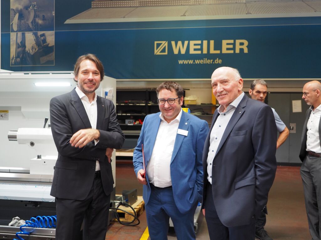 Von links nach rechts: Alexander Eisler, geschäftsführender Gesellschafter Weiler, Staatssekretär Tobias Gotthardt und Franz Rechberger, Leiter Konstruktion und Entwicklung Bild: Weiler Werkzeugmaschinen GmbH